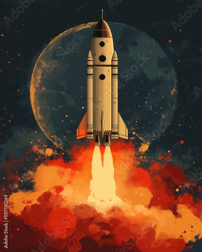 Obraz premium A rocket launches into the vibrant sky, surrounded by billowing clouds and a...