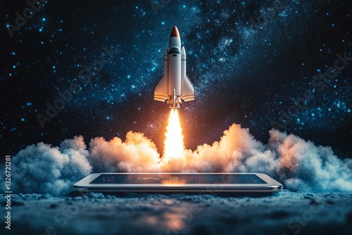 Fototapeta premium A Rocket Launching From Above A Digital Tablet Displaying Data