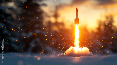 Fototapeta premium A rocket launching into space, symbolizing business expansion, Realistic Photo Professional photography, Warm, soft directional lighting with diffused shadows,