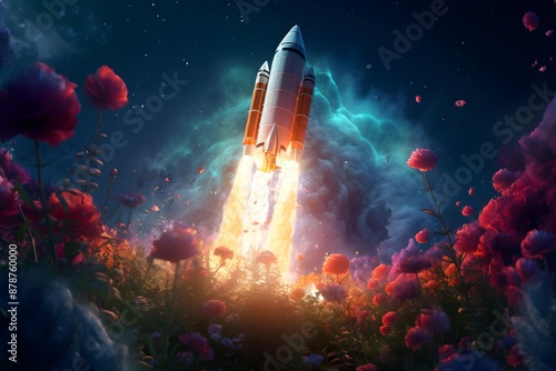 © TrubiAnna, Obraz premium A rocket takes off into space from a field of flowers