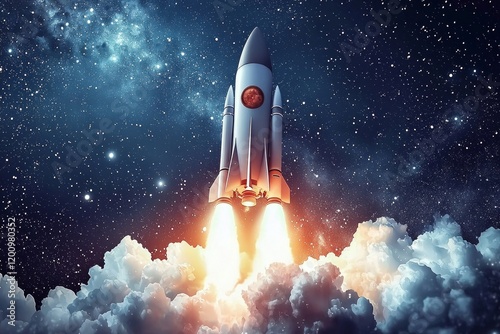 Fototapeta premium A rocket, taking off into space. Smoke is coming out from the engines, and there are white clouds around it, against a space background.