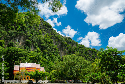 © k33pcalmncapture, Fototapeta premium A rocky cliffs covered in lush green vegetation with orange roof of Wat Tum Khao Chakan, Sa Kaeo, Thailand
