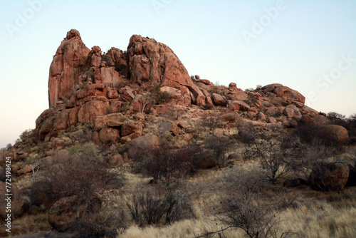 Fototapeta premium A rocky hill in a rocky arid terrain under a blue sky. Desert landscape and...