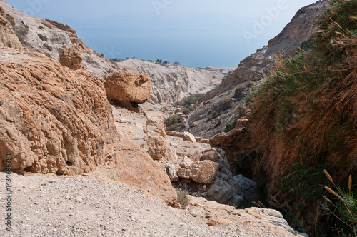 Fototapeta premium A rocky mountain with a body of water in the background