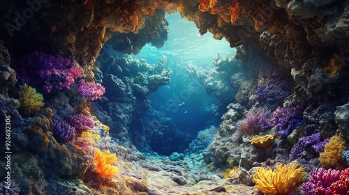 Naklejka premium A rocky underwater cave entrance, with colorful coral growing along the walls.
