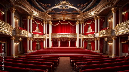 © fotogurme, Obraz premium A Rococo theater featuring a grand stage ornate balconies and plush red seats with gold trimmings