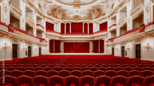 © fotogurme, Obraz premium A Rococo theater featuring a grand stage ornate balconies and plush red seats with gold trimmings