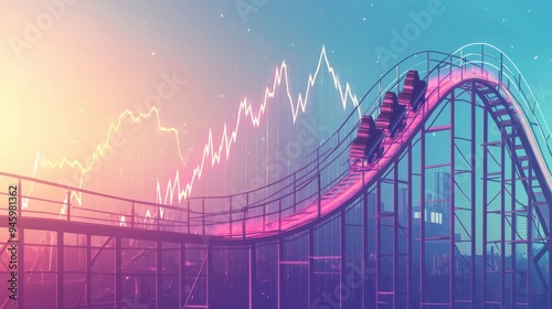 © Exnoi, Obraz premium A rollercoaster track shaped like a graph line, with steep climbs and sharp drops, featuring market symbols riding the track