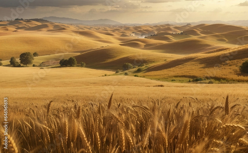 © Creative_Bringer, Obraz premium A rolling hills of gold wheat field nature background.