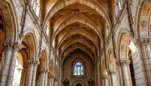 © wpw, Fototapeta premium a romanesque side arch in a cathedral with semicircular stone vaults thick columns sculpted capitals and floral carvings producing authentic historic european medieval style