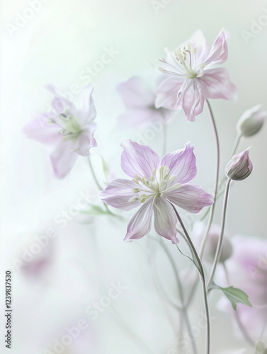 © seogi, Fototapeta premium A romantic art piece background with a soft texture, as if painted with watercolor, with pale pastel purple and green flowers and leaves.