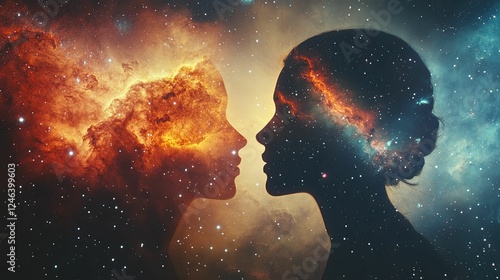 Obraz premium A romantic couple's profile silhouettes blending into a radiant