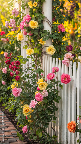 Fototapeta premium A romantic garden pathway lined with a white picket fence adorned with colorful roses and green vines.