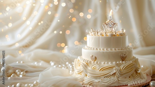 © Amy's Atelier, Fototapeta premium A romantic pearl-themed cake with heart-shaped pearls and floral piping