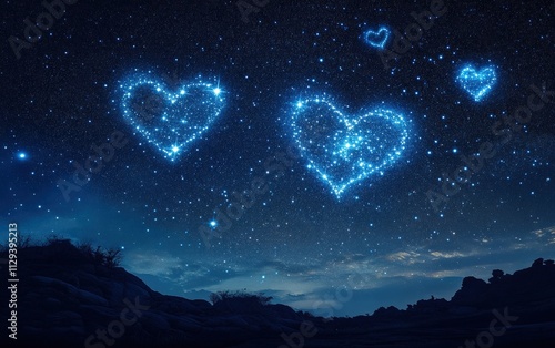 © Sergey Fedchenko, Obraz premium A romantic starry night sky with heart-shaped constellations glowing brightly for valentines day