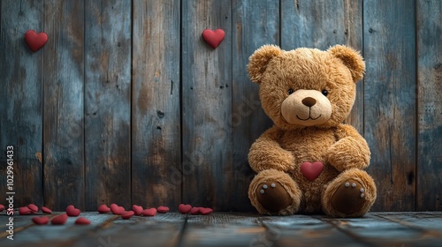 © Lina, Obraz premium A romantic teddy bear with hearts on wood adorns a digital wallpaper.
