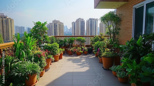 Fototapeta premium A rooftop garden with lush plants, bringing green to the concrete