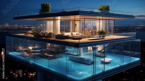 © Yasi Lens, Obraz premium A rooftop pool with a glass-bottom section showcasing the interior of the home.