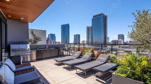 Obraz premium A rooftop terrace in an urban setting, complete with a barbecue area, loungers, and high-rise buildings in the distance
