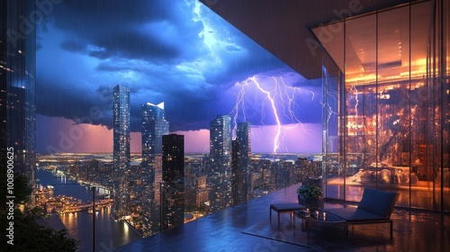 © Penatic Studio, Fototapeta premium A Rooftop Terrace Overlooking a Cityscape During a Thunderstorm