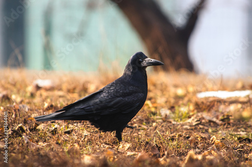 Obraz premium A rook bird runs somewhere on a beautiful background, the photo is in focus...