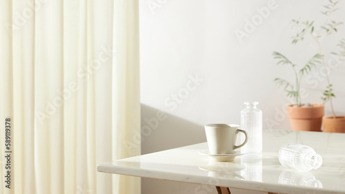 Obraz premium A room with a calm atmosphere, with clay pots placed in front of the wall and curtains letting in natural light. Glass bottles, coffee, and various objects on a marble table.