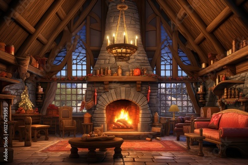 © cff999, Fototapeta premium a room with a fireplace and a couch