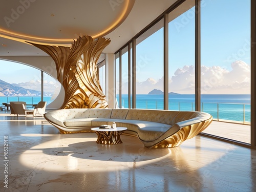 © kholik, Fototapeta premium a room with a large window and a couch with a table and chairs.
