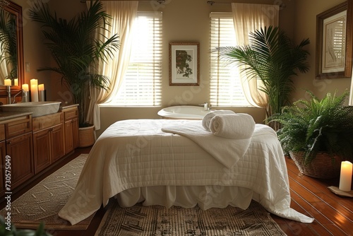 © 2D_Jungle, Obraz premium A room with a soaking tub inside a spa business