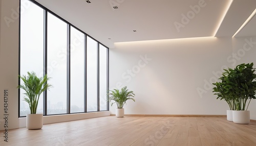 © soyibakter, Fototapeta premium a room with a white wall and a green plant in the corner.