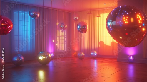 Obraz premium A room with many shiny, colorful balls hanging from the ceiling