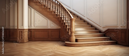 © TheWaterMeloonProjec, Obraz premium A room with wooden floors is shown empty, featuring a staircase with a skirting board. The space appears devoid of furniture or occupants, showcasing the staircases design and the natural wood finish