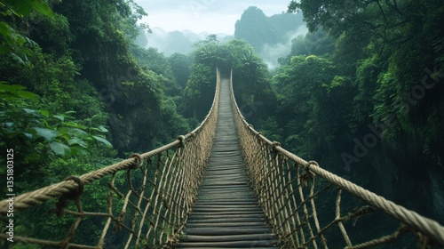 © Af, Obraz premium A rope bridge stretching across a lush, misty rainforest canyon.