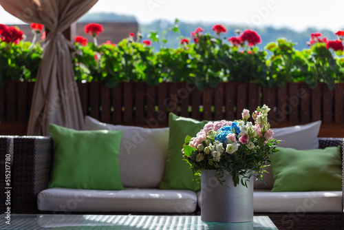 Obraz premium A rose bouquet in a box on a summer terrace. A bouquet of pink and white...