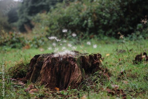 Obraz premium A rotting tree stump in a meadow, with spores puffing out like a tiny geyser.