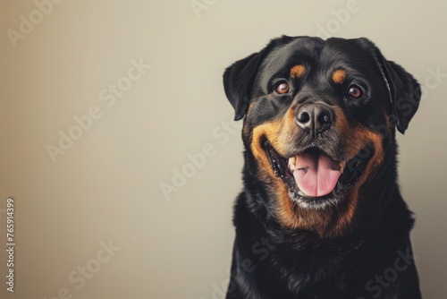 Obraz premium A Rottweiler with an endearing smile, positioned centrally against a neutral backdrop, allowing for text placement on the right side.