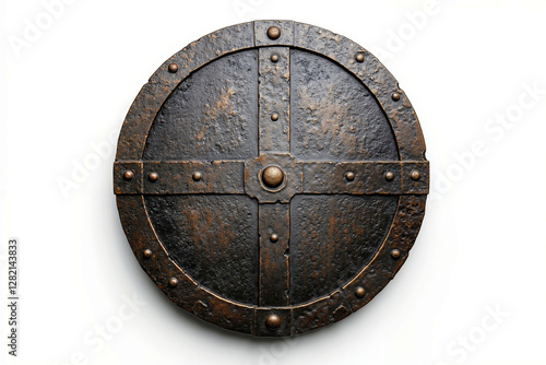 © stanhert, Fototapeta premium A round metal shield on a white background