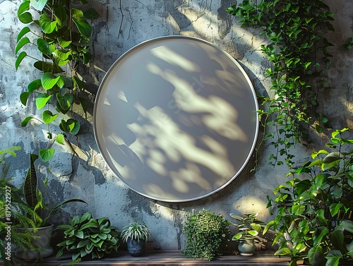© VISUAL BACKGROUND, Obraz premium A round mirror on a wall with plants and flowers.