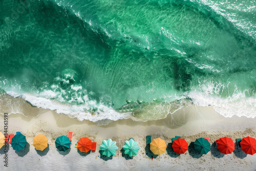 Fototapeta premium A row of beach umbrellas are lined up on the beach