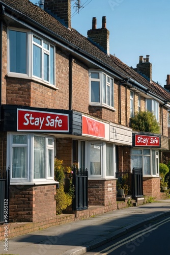 © AURA COLLECTIONS, Naklejka premium A row of brick houses with signs promoting safety.