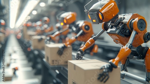 Fototapeta premium A row of bright orange industrial robots works on an assembly line, packing boxes on a conveyor belt in a high-tech warehouse. The image emphasizes automation, industrial efficiency, and modern
