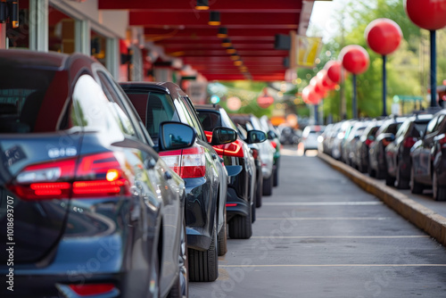 © mila103, Obraz premium A row of cars are parked in a lot, with a few of them being red