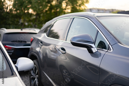 © sofiko14, Fototapeta premium A row of cars parked outdoors, showcasing modern automotive design and urban transportation.