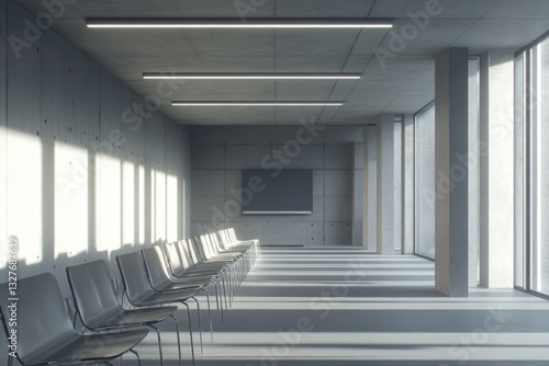 © Alena, Fototapeta premium A row of chairs in a room with large windows, ideal for office or home decor