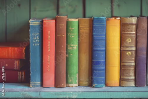 Naklejka premium A row of colorful books on a shelf. The books are arranged in a rainbow...