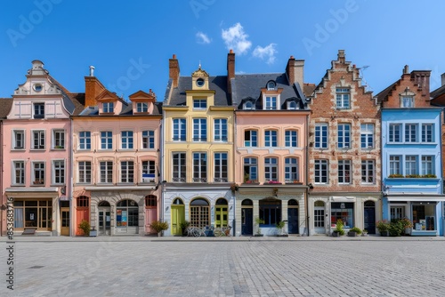 © Sasikharn, Fototapeta premium A row of colorful buildings with a cobblestone street in front
