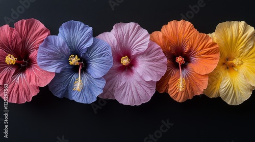 © Albert, Fototapeta premium A row of colorful hibiscus flowers on a black background