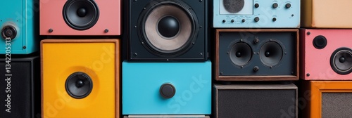 © Andrii Zastrozhnov, Obraz premium A row of colorful speakers are displayed, with some of them being pink, yellow, and blue. The speakers are arranged in a way that creates a visually appealing and colorful display