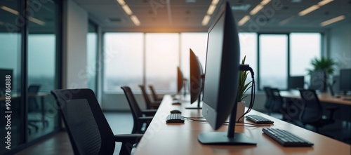 © Pixel Matrix, Fototapeta premium A row of computers sitting on top of a wooden desk.