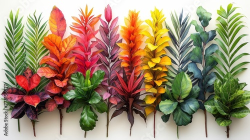 © Mikus, Fototapeta premium a row of different colored leaves on top of each other in front of a white wall with a white background.